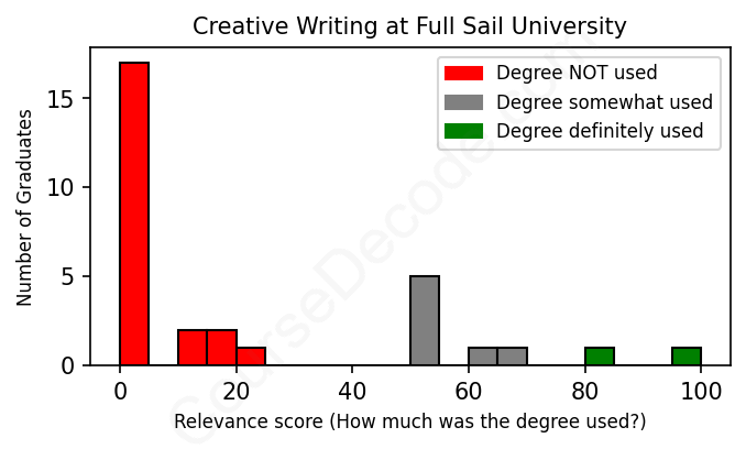 The verdict? Horrible! Overall, with an average relevance score of 21%, Creative Writing graduates from Full Sail University have an exceptionally lower likelihood (-46%) of finding work in this field compared to the average graduate across all fields: