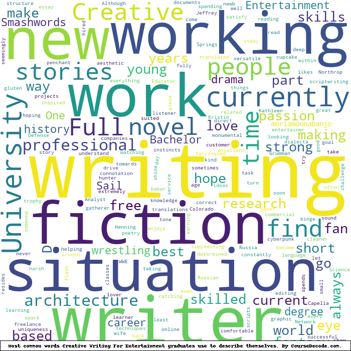 Here is a visual representation of the most common words seen in the "about" section of LinkedIn profiles who have a Bachelor degree in Creative Writing For Entertainment (this is across all Creative Writing For Entertainment graduates we've analyzed, not just those who went to Full Sail University). This may or may not be useful: