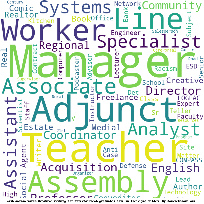 Here is a visual representation of the most common words in job titles for Creative Writing For Entertainment graduates (this is across all Creative Writing For Entertainment graduates we've analyzed, not just those who went to Full Sail University):