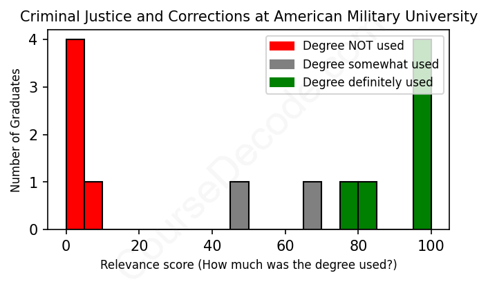 The verdict? Significantly below average. Overall, with an average relevance score of 52%, Criminal Justice and Corrections graduates from American Military University have a much lower likelihood (-15%) of finding work in this field compared to the average graduate across all fields: