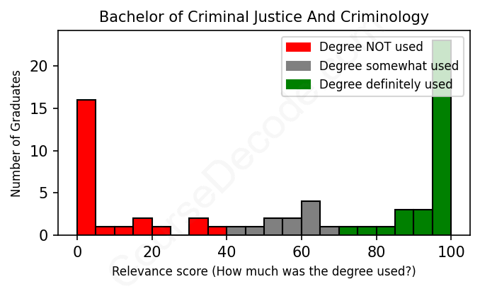 The verdict? Below average. Overall, with an average relevance score of 57%, Criminal Justice And Criminology graduates have a lower likelihood (-10%) of finding work in this field compared to the average graduate across all fields: