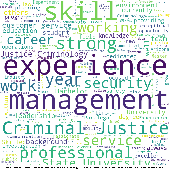 Here is a visual representation of the most common words seen in the "about" section of LinkedIn profiles who have a Bachelor degree in Criminal Justice And Criminology. This may or may not be useful: