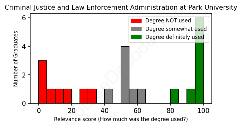 The verdict? Significantly below average. Overall, with an average relevance score of 53%, Criminal Justice and Law Enforcement Administration graduates from Park University have a much lower likelihood (-14%) of finding work in this field compared to the average graduate across all fields: