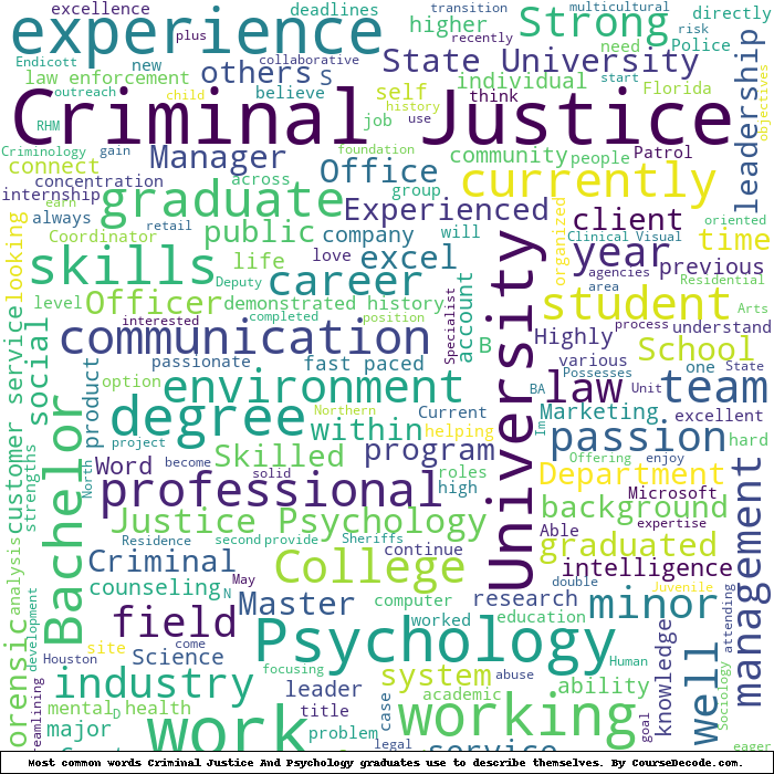 Here is a visual representation of the most common words seen in the "about" section of LinkedIn profiles who have a Bachelor degree in Criminal Justice And Psychology. This may or may not be useful: