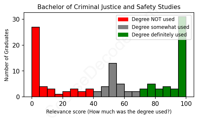 The verdict? Significantly below average. Overall, with an average relevance score of 52%, Criminal Justice and Safety Studies graduates have a much lower likelihood (-15%) of finding work in this field compared to the average graduate across all fields: