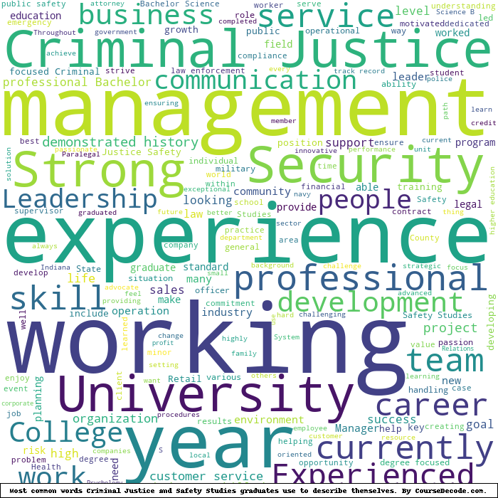 Here is a visual representation of the most common words seen in the "about" section of LinkedIn profiles who have a Bachelor degree in Criminal Justice and Safety Studies. This may or may not be useful: