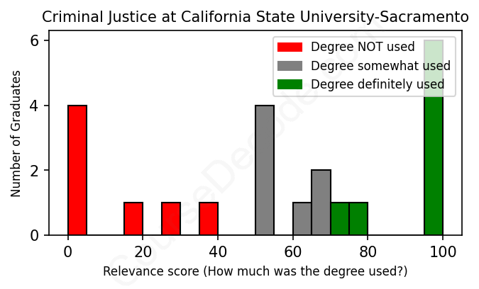 The verdict? Significantly below average. Overall, with an average relevance score of 55%, Criminal Justice graduates from California State University-Sacramento have a much lower likelihood (-12%) of finding work in this field compared to the average graduate across all fields: