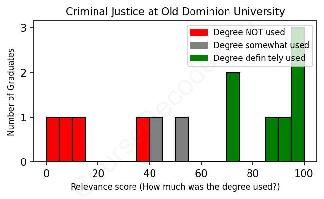 The verdict? Below average. Overall, with an average relevance score of 59%, Criminal Justice graduates from Old Dominion University have a lower likelihood (-8%) of finding work in this field compared to the average graduate across all fields: