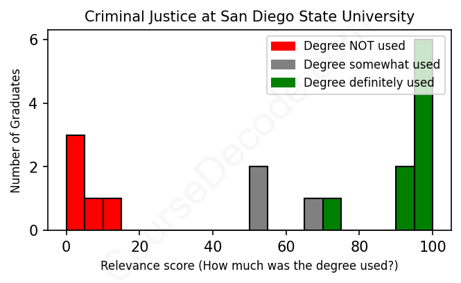 The verdict? Below average. Overall, with an average relevance score of 61%, Criminal Justice graduates from San Diego State University have a lower likelihood (-6%) of finding work in this field compared to the average graduate across all fields: