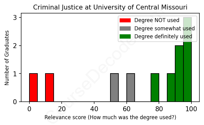 The verdict? Slightly above average. Overall, with an average relevance score of 70%, Criminal Justice graduates from University of Central Missouri have a slightly higher likelihood (+3%) of finding work in this field compared to the average graduate across all fields: