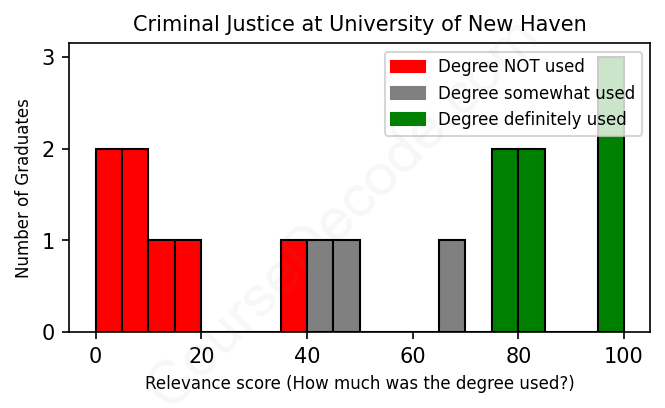 The verdict? Significantly below average. Overall, with an average relevance score of 49%, Criminal Justice graduates from University of New Haven have a much lower likelihood (-18%) of finding work in this field compared to the average graduate across all fields: