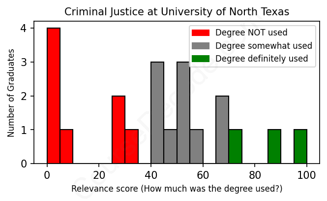 The verdict? Bad. Overall, with an average relevance score of 41%, Criminal Justice graduates from University of North Texas have a substantially lower likelihood (-26%) of finding work in this field compared to the average graduate across all fields: