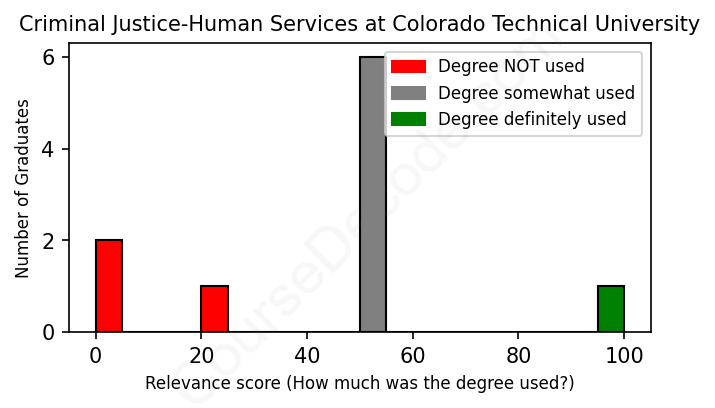 The verdict? Bad. Overall, with an average relevance score of 42%, Criminal Justice-Human Services graduates from Colorado Technical University have a substantially lower likelihood (-25%) of finding work in this field compared to the average graduate across all fields: