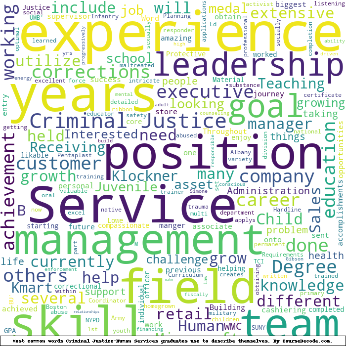 Here is a visual representation of the most common words seen in the "about" section of LinkedIn profiles who have a Bachelor degree in Criminal Justice-Human Services (this is across all Criminal Justice-Human Services graduates we've analyzed, not just those who went to Colorado Technical University). This may or may not be useful:
