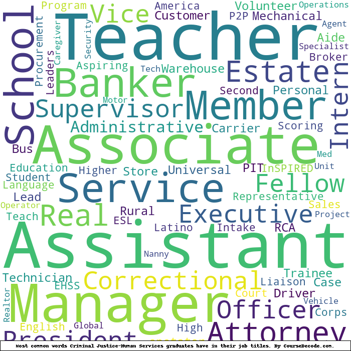 Here is a visual representation of the most common words in job titles for Criminal Justice-Human Services graduates (this is across all Criminal Justice-Human Services graduates we've analyzed, not just those who went to Colorado Technical University):