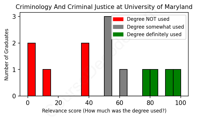 The verdict? Significantly below average. Overall, with an average relevance score of 49%, Criminology And Criminal Justice graduates from University of Maryland have a much lower likelihood (-18%) of finding work in this field compared to the average graduate across all fields: