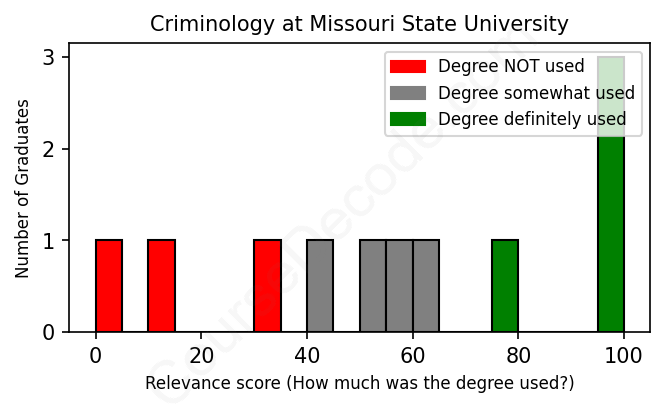 The verdict? Below average. Overall, with an average relevance score of 57%, Criminology graduates from Missouri State University have a lower likelihood (-10%) of finding work in this field compared to the average graduate across all fields: