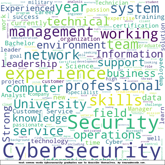Here is a visual representation of the most common words seen in the "about" section of LinkedIn profiles who have a Bachelor degree in Cybersecurity. This may or may not be useful: