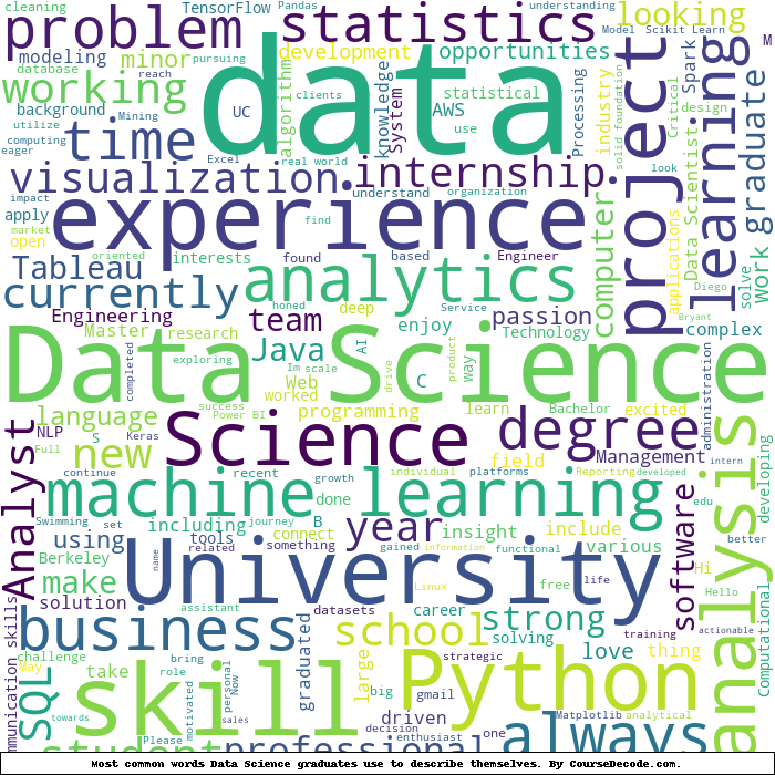 Here is a visual representation of the most common words seen in the "about" section of LinkedIn profiles who have a Bachelor degree in Data Science. This may or may not be useful: