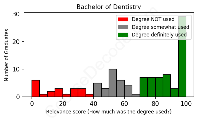 The verdict? Slightly below average. Overall, with an average relevance score of 66%, Dentistry graduates have a slightly lower likelihood (-1%) of finding work in this field compared to the average graduate across all fields: