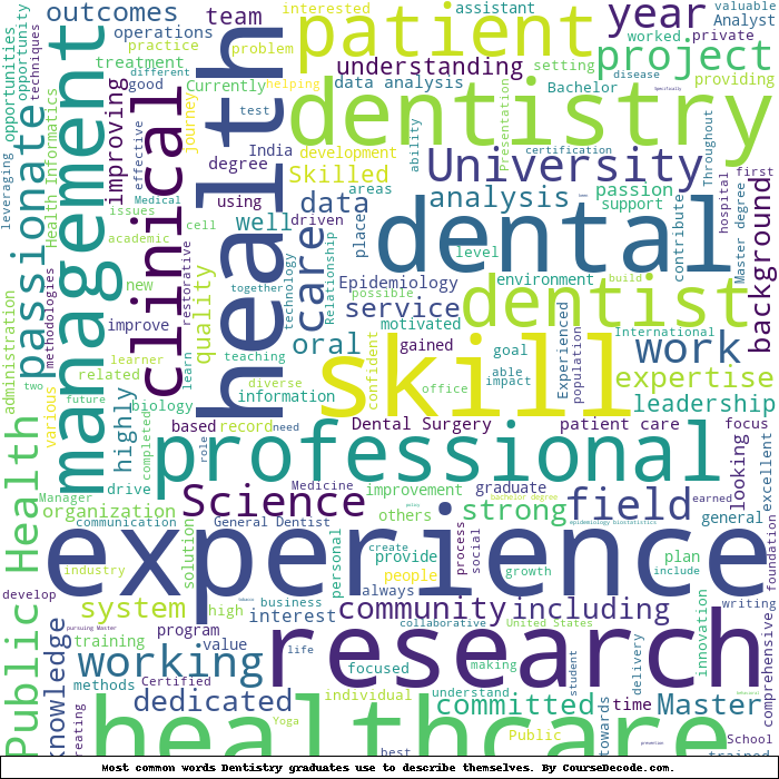 Here is a visual representation of the most common words seen in the "about" section of LinkedIn profiles who have a Bachelor degree in Dentistry. This may or may not be useful: