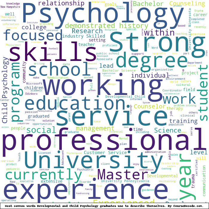 Here is a visual representation of the most common words seen in the "about" section of LinkedIn profiles who have a Bachelor degree in Developmental and Child Psychology. This may or may not be useful:
