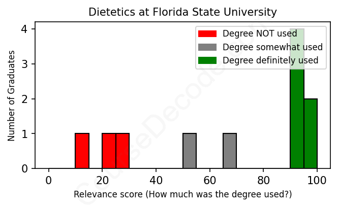 The verdict? On par with the average. Overall, with an average relevance score of 67%, Dietetics graduates from Florida State University have about the same likelihood of finding work in this field as the average graduate across all fields: