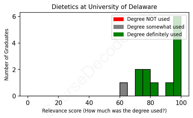 The verdict? Significantly above average. Overall, with an average relevance score of 87%, Dietetics graduates from University of Delaware have a much higher likelihood (+20%) of finding work in this field compared to the average graduate across all fields: