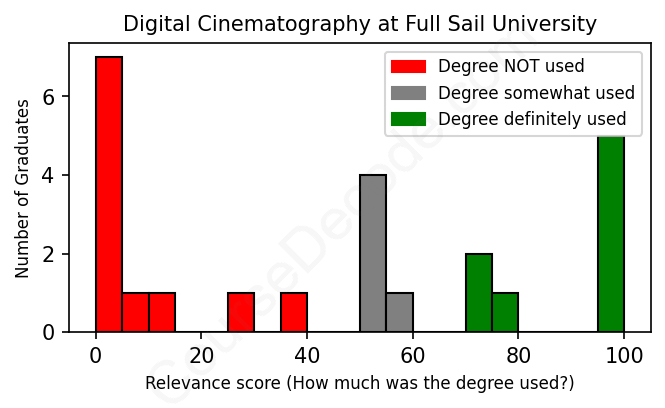The verdict? Bad. Overall, with an average relevance score of 44%, Digital Cinematography graduates from Full Sail University have a substantially lower likelihood (-23%) of finding work in this field compared to the average graduate across all fields: