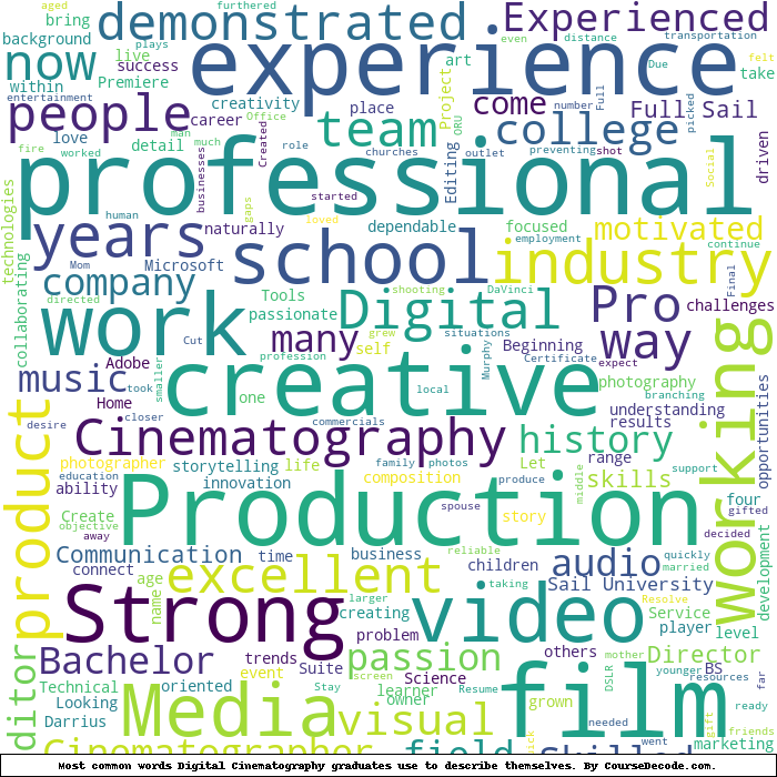 Here is a visual representation of the most common words seen in the "about" section of LinkedIn profiles who have a Bachelor degree in Digital Cinematography (this is across all Digital Cinematography graduates we've analyzed, not just those who went to Full Sail University). This may or may not be useful: