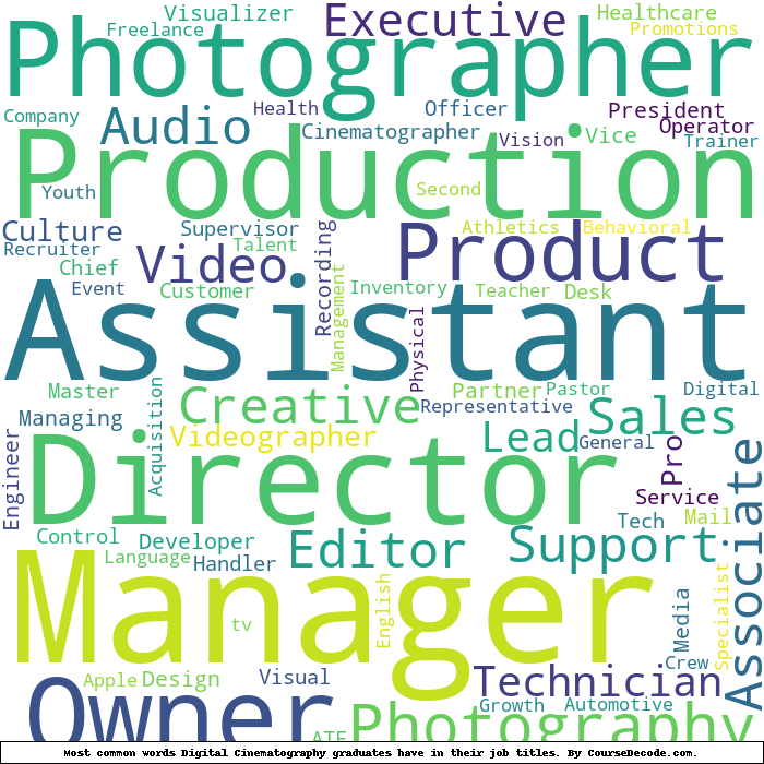 Here is a visual representation of the most common words in job titles for Digital Cinematography graduates (this is across all Digital Cinematography graduates we've analyzed, not just those who went to Full Sail University):