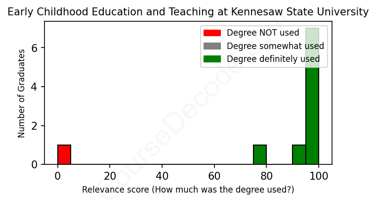 The verdict? Significantly above average. Overall, with an average relevance score of 86%, Early Childhood Education and Teaching graduates from Kennesaw State University have a much higher likelihood (+19%) of finding work in this field compared to the average graduate across all fields: