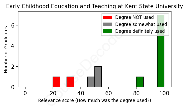 The verdict? Above average. Overall, with an average relevance score of 75%, Early Childhood Education and Teaching graduates from Kent State University have a higher likelihood (+8%) of finding work in this field compared to the average graduate across all fields: