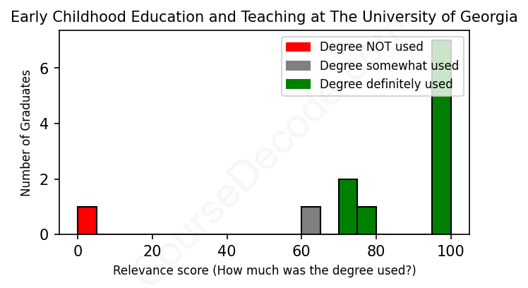 The verdict? Significantly above average. Overall, with an average relevance score of 81%, Early Childhood Education and Teaching graduates from The University of Georgia have a much higher likelihood (+14%) of finding work in this field compared to the average graduate across all fields: