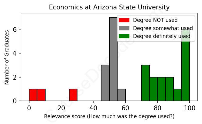 The verdict? Slightly below average. Overall, with an average relevance score of 66%, Economics graduates from Arizona State University have a slightly lower likelihood (-1%) of finding work in this field compared to the average graduate across all fields: