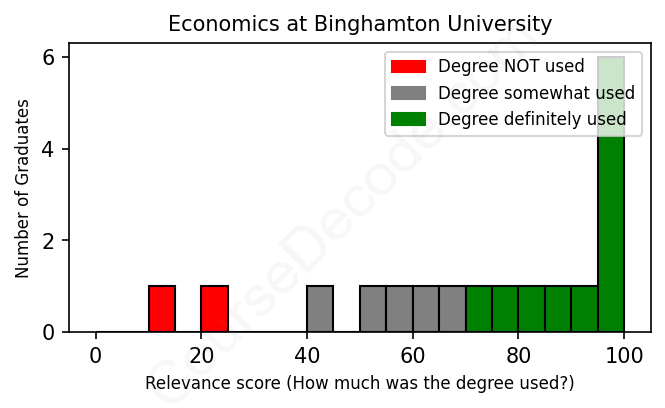 The verdict? Slightly above average. Overall, with an average relevance score of 72%, Economics graduates from Binghamton University have a slightly higher likelihood (+5%) of finding work in this field compared to the average graduate across all fields: