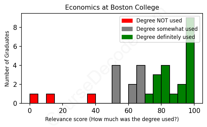 The verdict? Above average. Overall, with an average relevance score of 73%, Economics graduates from Boston College have a higher likelihood (+6%) of finding work in this field compared to the average graduate across all fields: