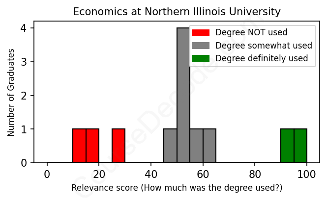 The verdict? Significantly below average. Overall, with an average relevance score of 51%, Economics graduates from Northern Illinois University have a much lower likelihood (-16%) of finding work in this field compared to the average graduate across all fields:
