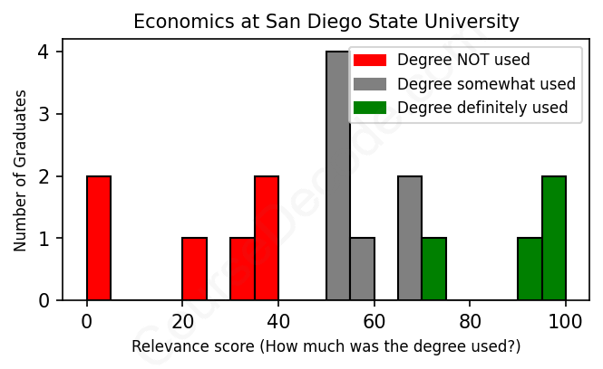The verdict? Significantly below average. Overall, with an average relevance score of 51%, Economics graduates from San Diego State University have a much lower likelihood (-16%) of finding work in this field compared to the average graduate across all fields: