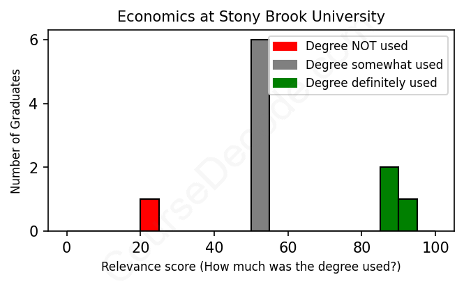 The verdict? Below average. Overall, with an average relevance score of 58%, Economics graduates from Stony Brook University have a lower likelihood (-9%) of finding work in this field compared to the average graduate across all fields: