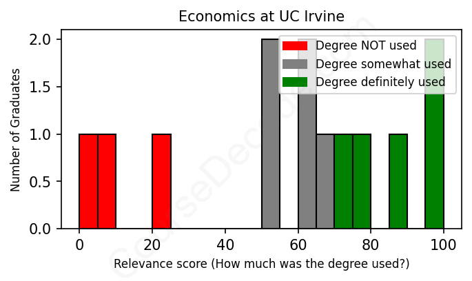The verdict? Below average. Overall, with an average relevance score of 58%, Economics graduates from UC Irvine have a lower likelihood (-9%) of finding work in this field compared to the average graduate across all fields: