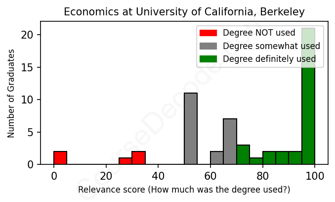 The verdict? Above average. Overall, with an average relevance score of 73%, Economics graduates from University of California, Berkeley have a higher likelihood (+6%) of finding work in this field compared to the average graduate across all fields: