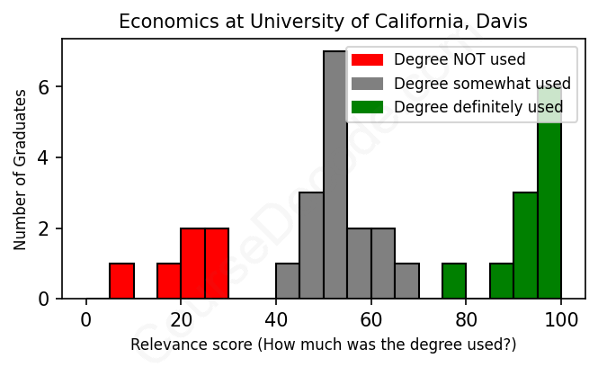 The verdict? Below average. Overall, with an average relevance score of 60%, Economics graduates from University of California, Davis have a lower likelihood (-7%) of finding work in this field compared to the average graduate across all fields: