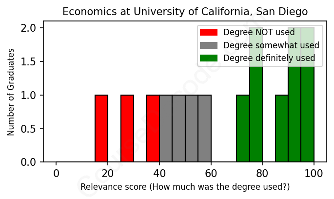 The verdict? Slightly below average. Overall, with an average relevance score of 65%, Economics graduates from University of California, San Diego have a slightly lower likelihood (-2%) of finding work in this field compared to the average graduate across all fields: