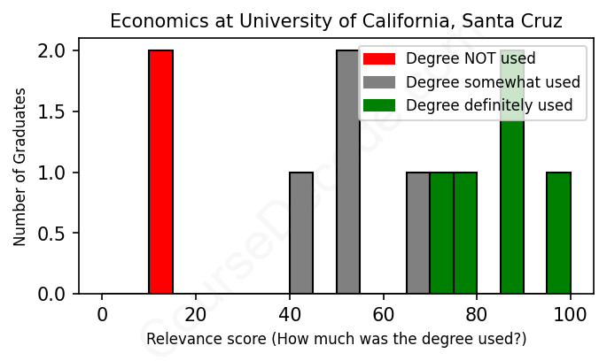 The verdict? Below average. Overall, with an average relevance score of 60%, Economics graduates from University of California, Santa Cruz have a lower likelihood (-7%) of finding work in this field compared to the average graduate across all fields:
