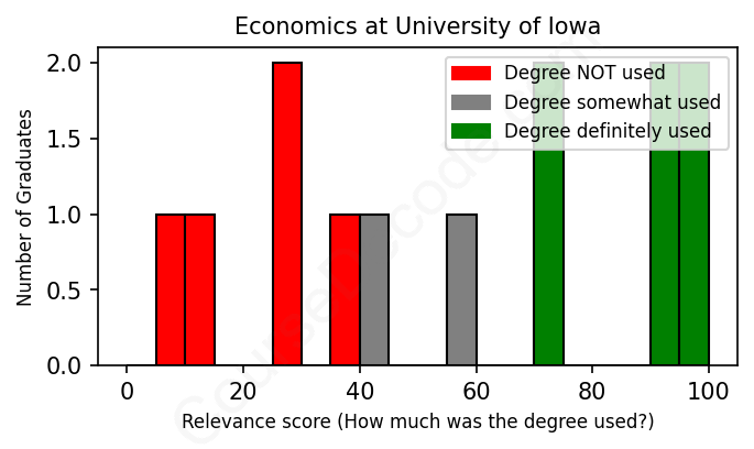 The verdict? Below average. Overall, with an average relevance score of 57%, Economics graduates from University of Iowa have a lower likelihood (-10%) of finding work in this field compared to the average graduate across all fields: