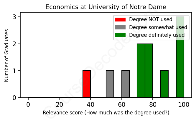 The verdict? Above average. Overall, with an average relevance score of 75%, Economics graduates from University of Notre Dame have a higher likelihood (+8%) of finding work in this field compared to the average graduate across all fields: