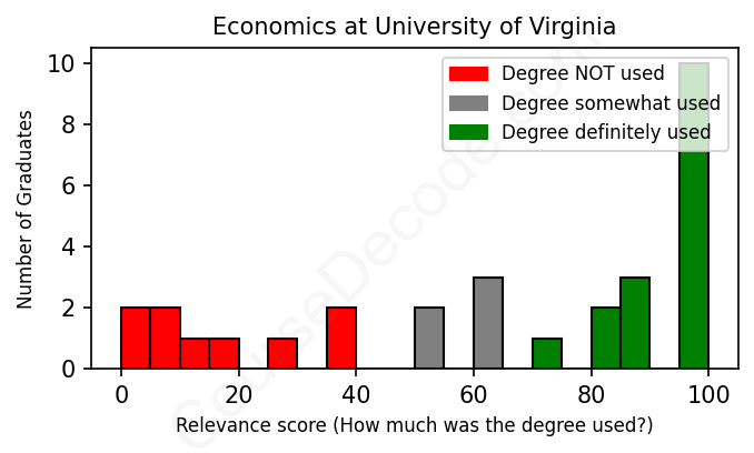 The verdict? Slightly below average. Overall, with an average relevance score of 63%, Economics graduates from University of Virginia have a slightly lower likelihood (-4%) of finding work in this field compared to the average graduate across all fields: