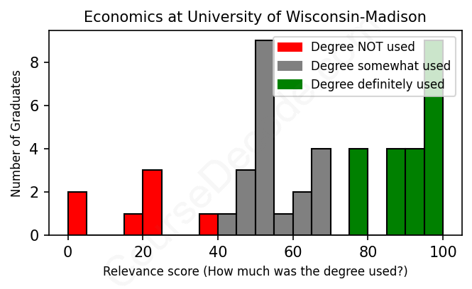 The verdict? Slightly below average. Overall, with an average relevance score of 64%, Economics graduates from University of Wisconsin-Madison have a slightly lower likelihood (-3%) of finding work in this field compared to the average graduate across all fields: