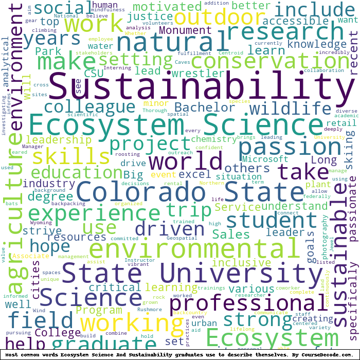 Here is a visual representation of the most common words seen in the "about" section of LinkedIn profiles who have a Bachelor degree in Ecosystem Science And Sustainability (this is across all Ecosystem Science And Sustainability graduates we've analyzed, not just those who went to Colorado State University). This may or may not be useful: